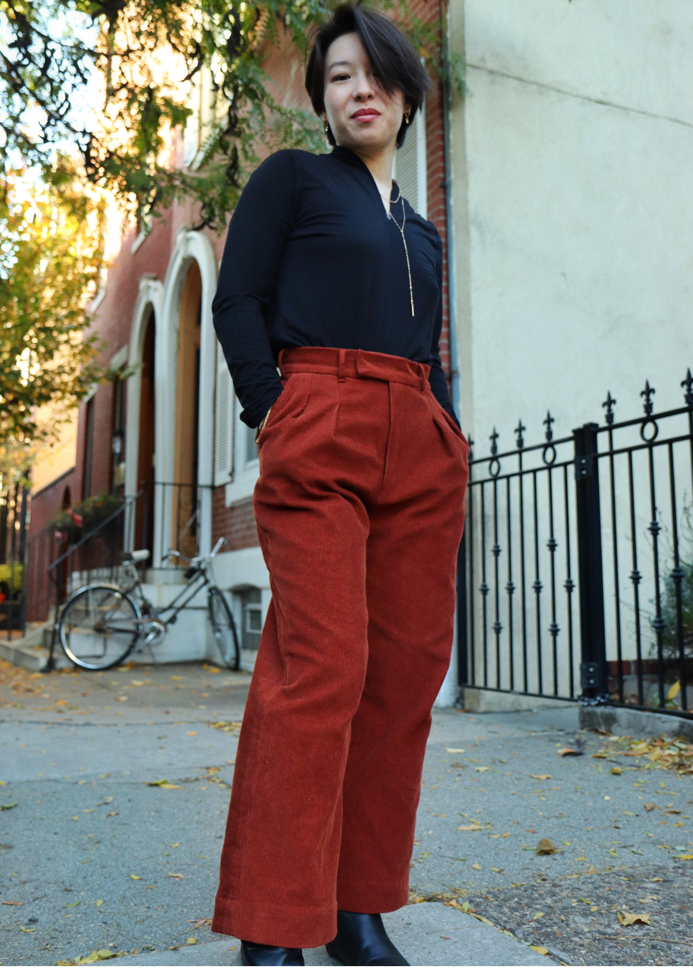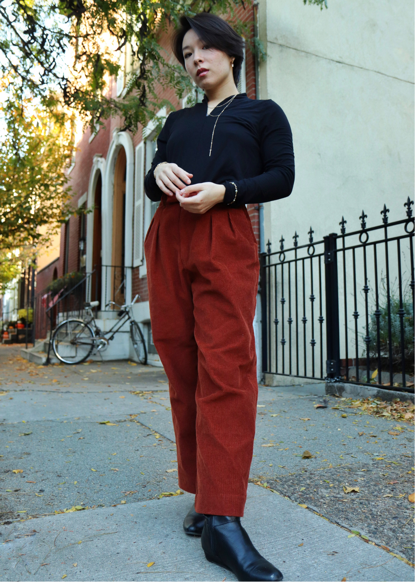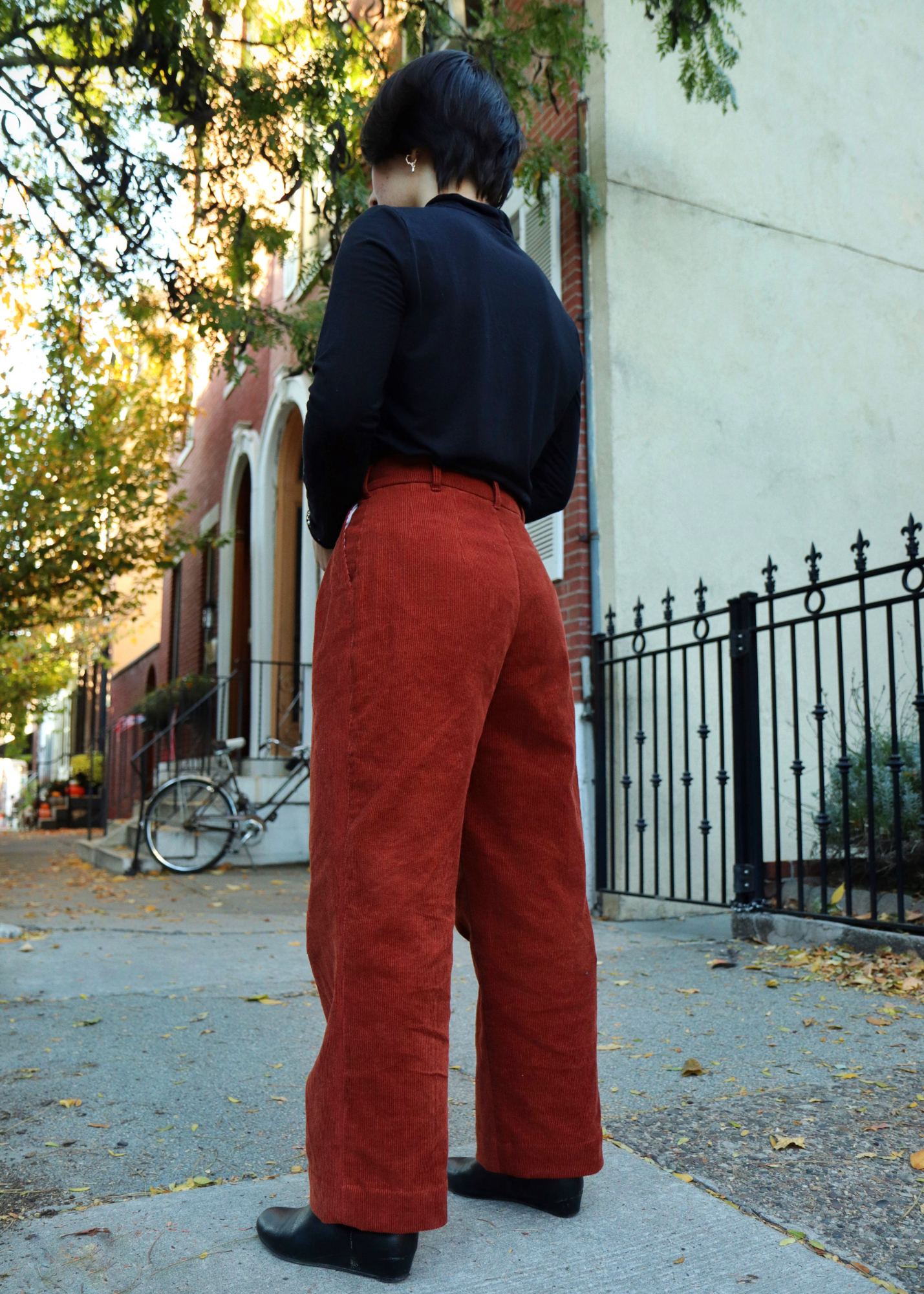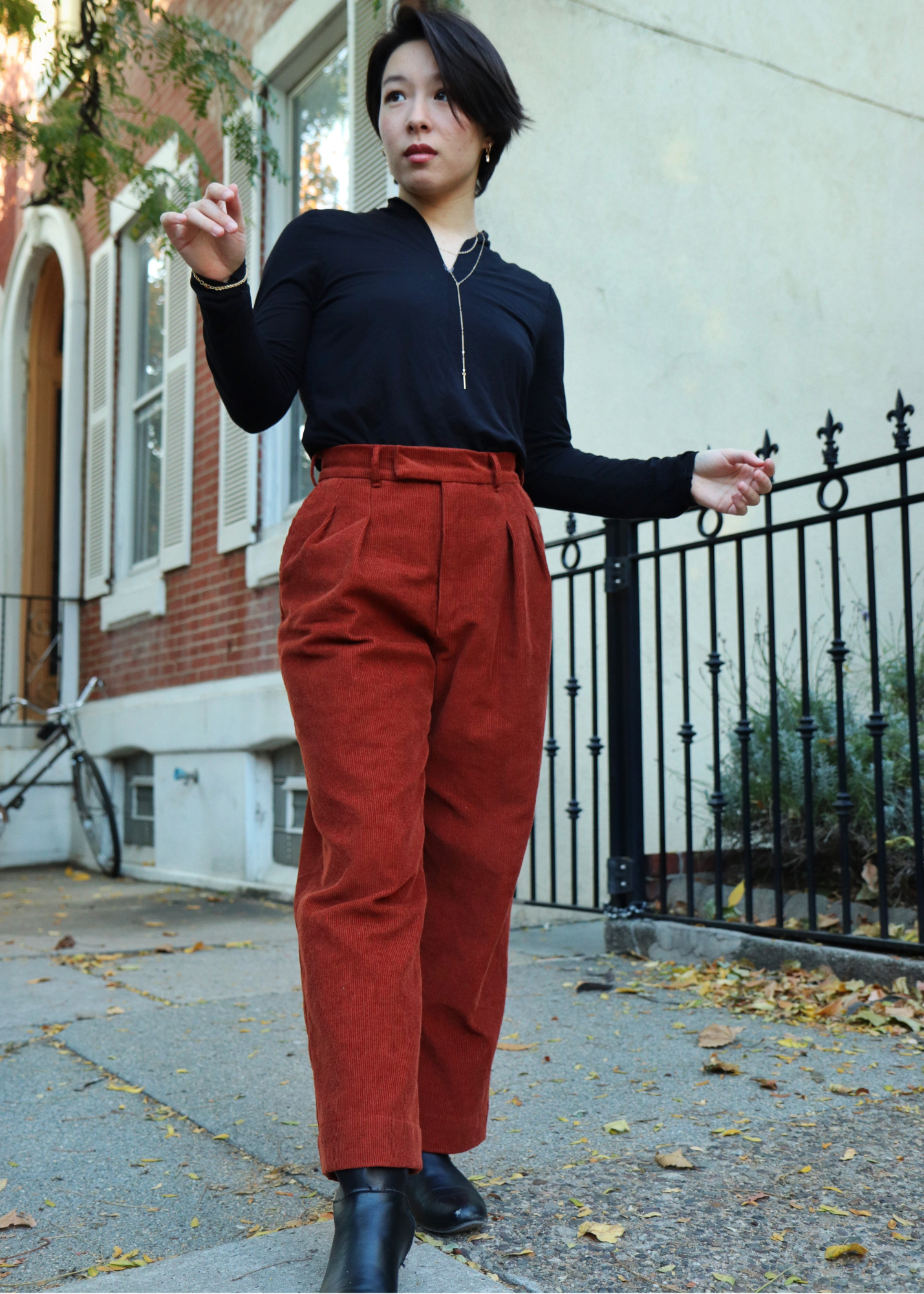 Ora in the grey suiting V1 and rust corduroy V2 is wearing size B with rise shortened 1.5" and inseam shortened 4". They are 5' tall with 26" waist and 35" hip