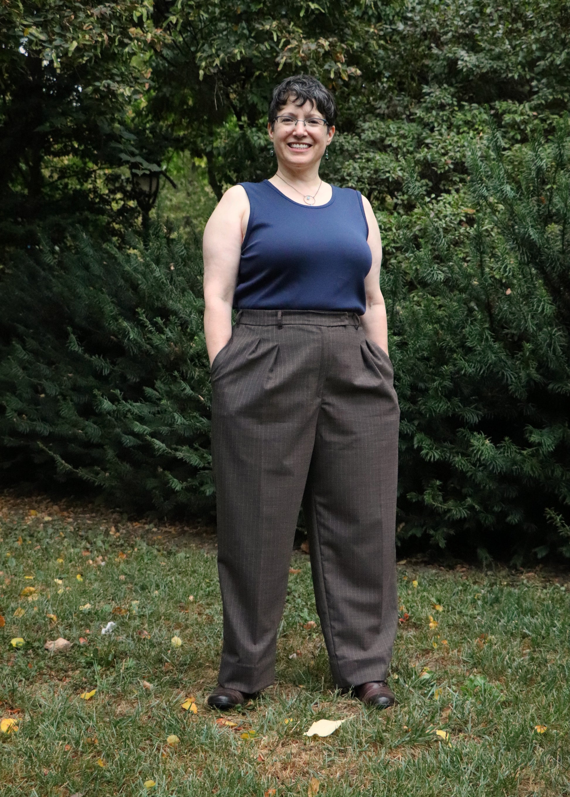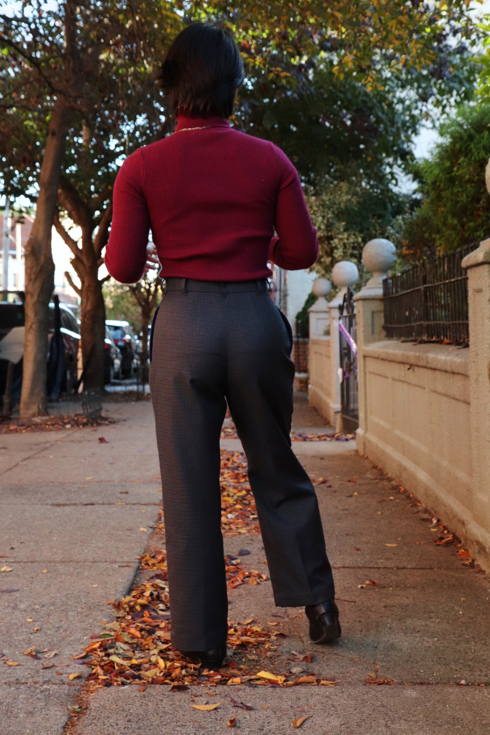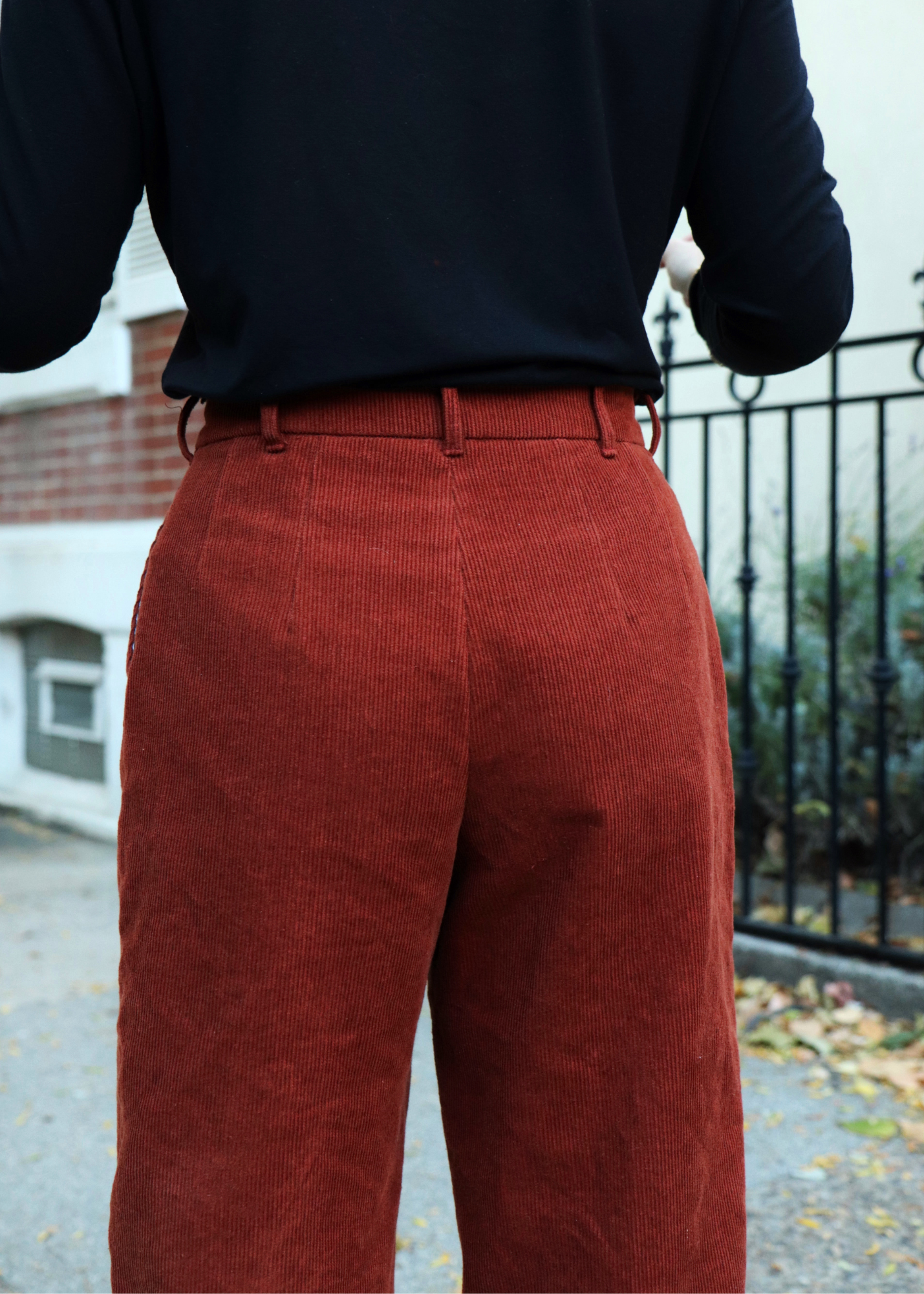 Ora in the grey suiting V1 and rust corduroy V2 is wearing size B with rise shortened 1.5" and inseam shortened 4". They are 5' tall with 26" waist and 35" hip