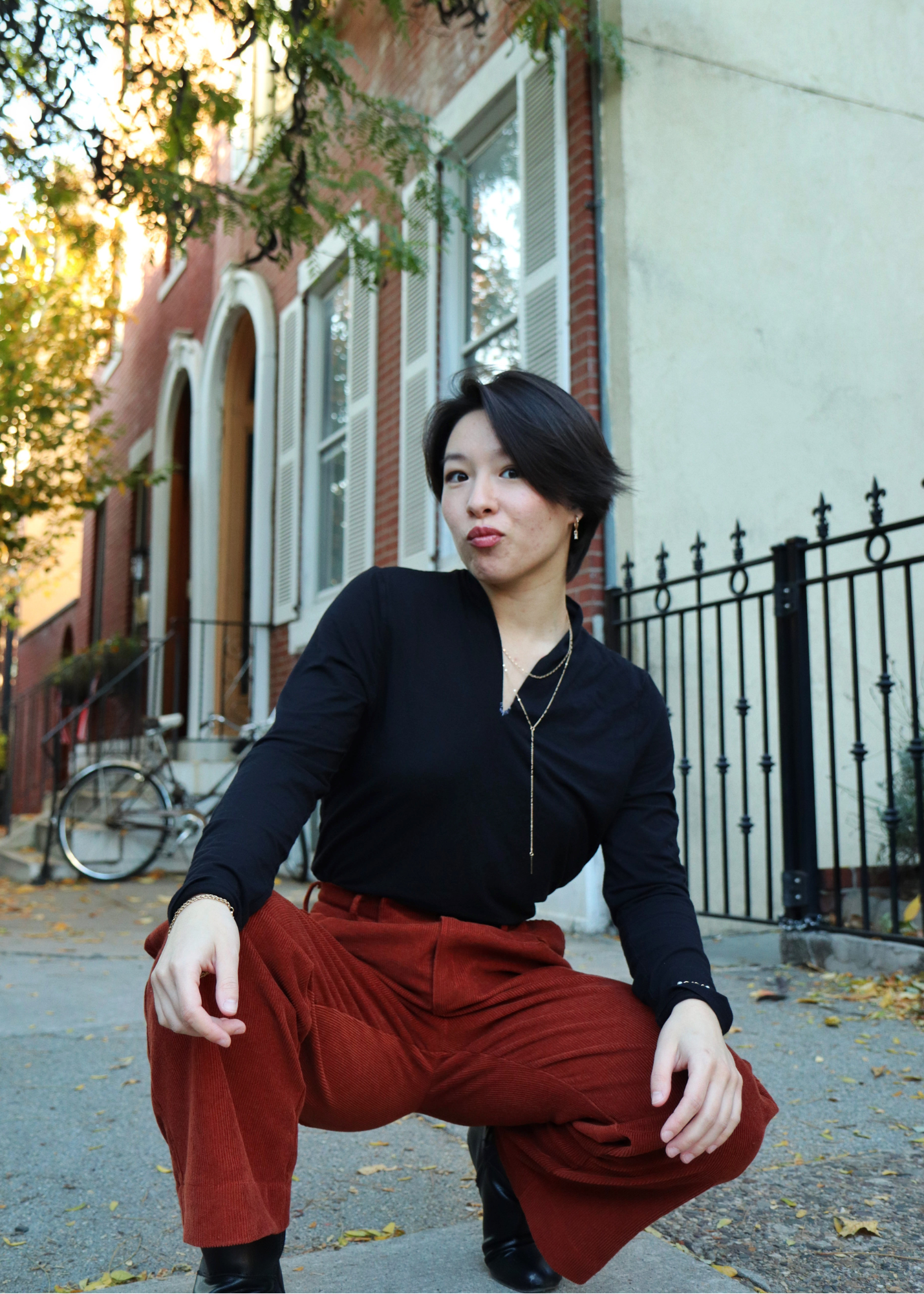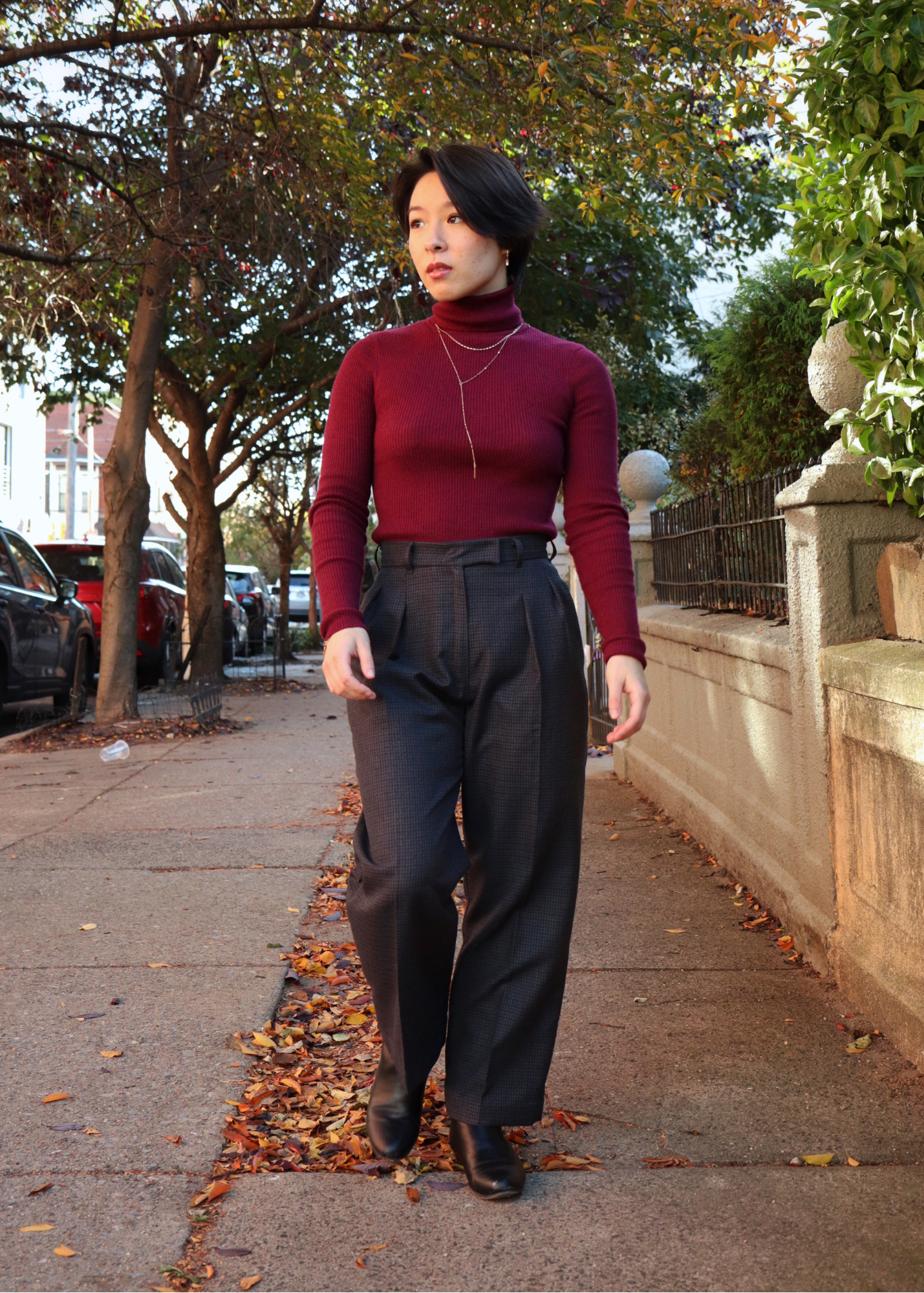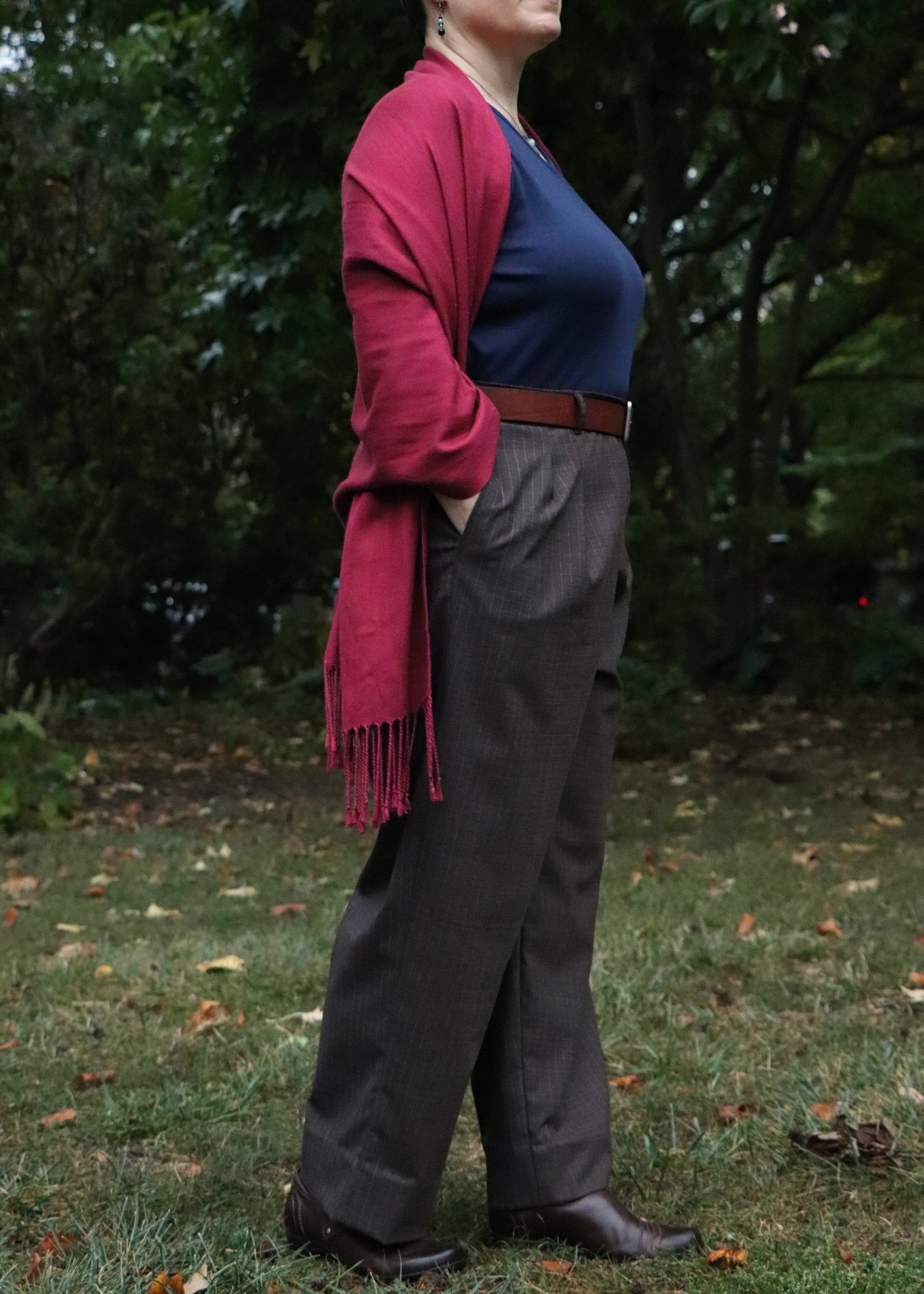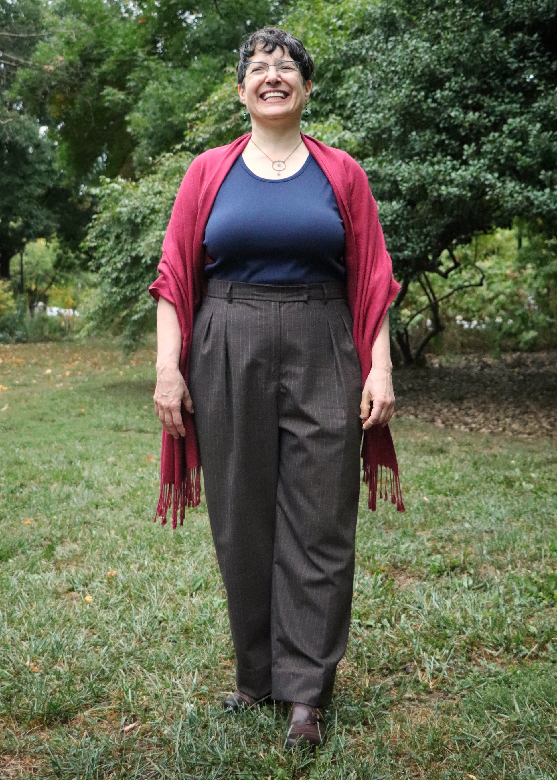 Ora in the grey suiting V1 and rust corduroy V2 is wearing size B with rise shortened 1.5" and inseam shortened 4". They are 5' tall with 26" waist and 35" hip
