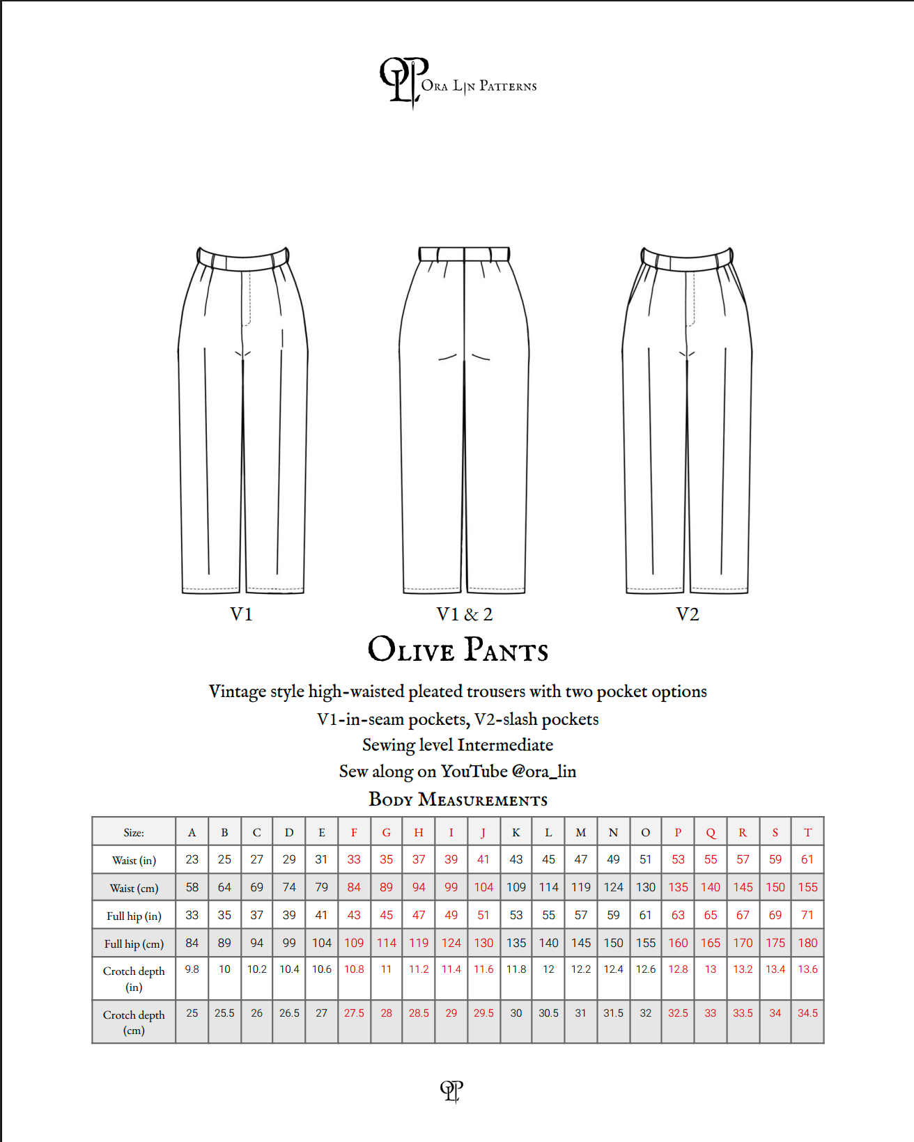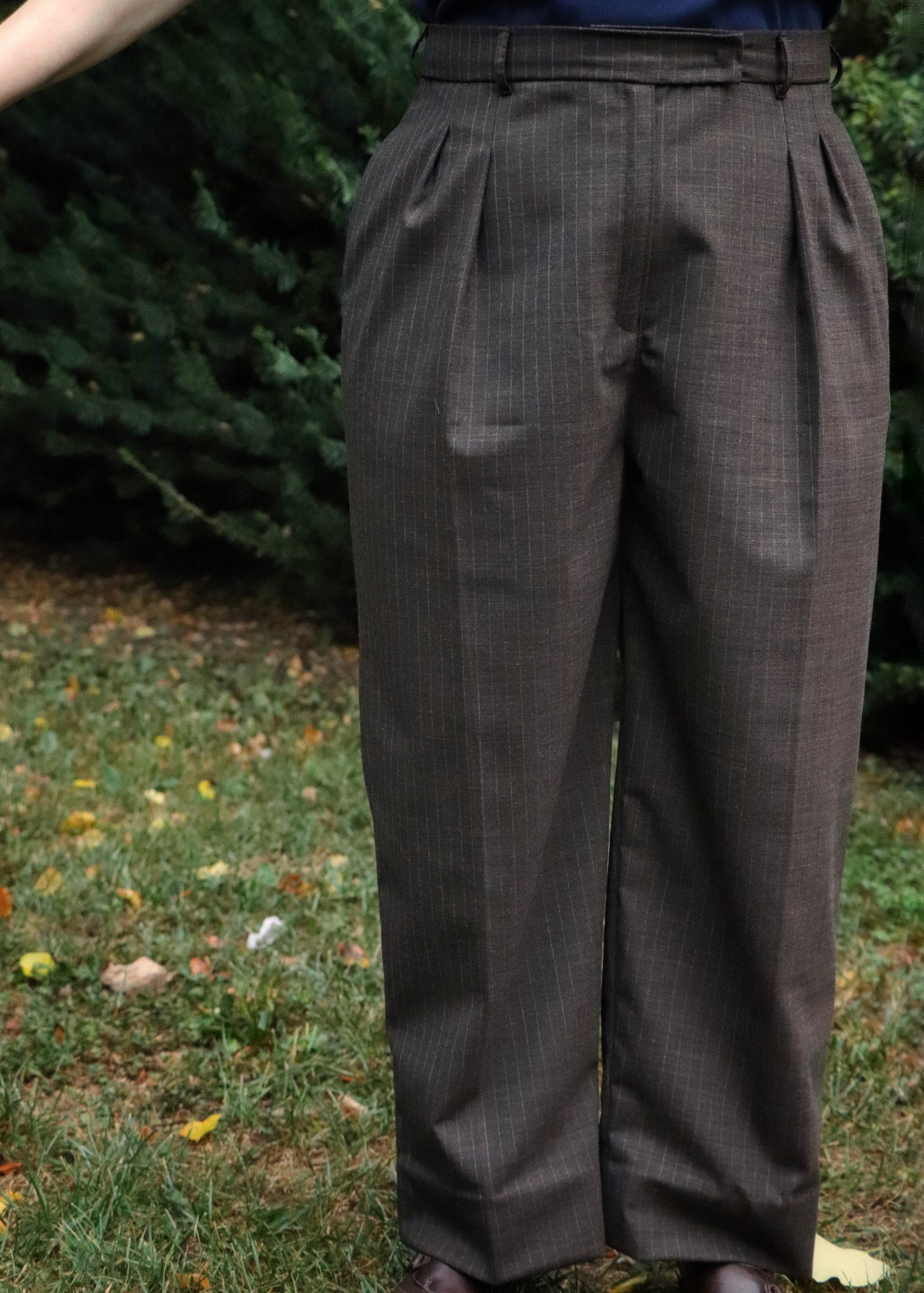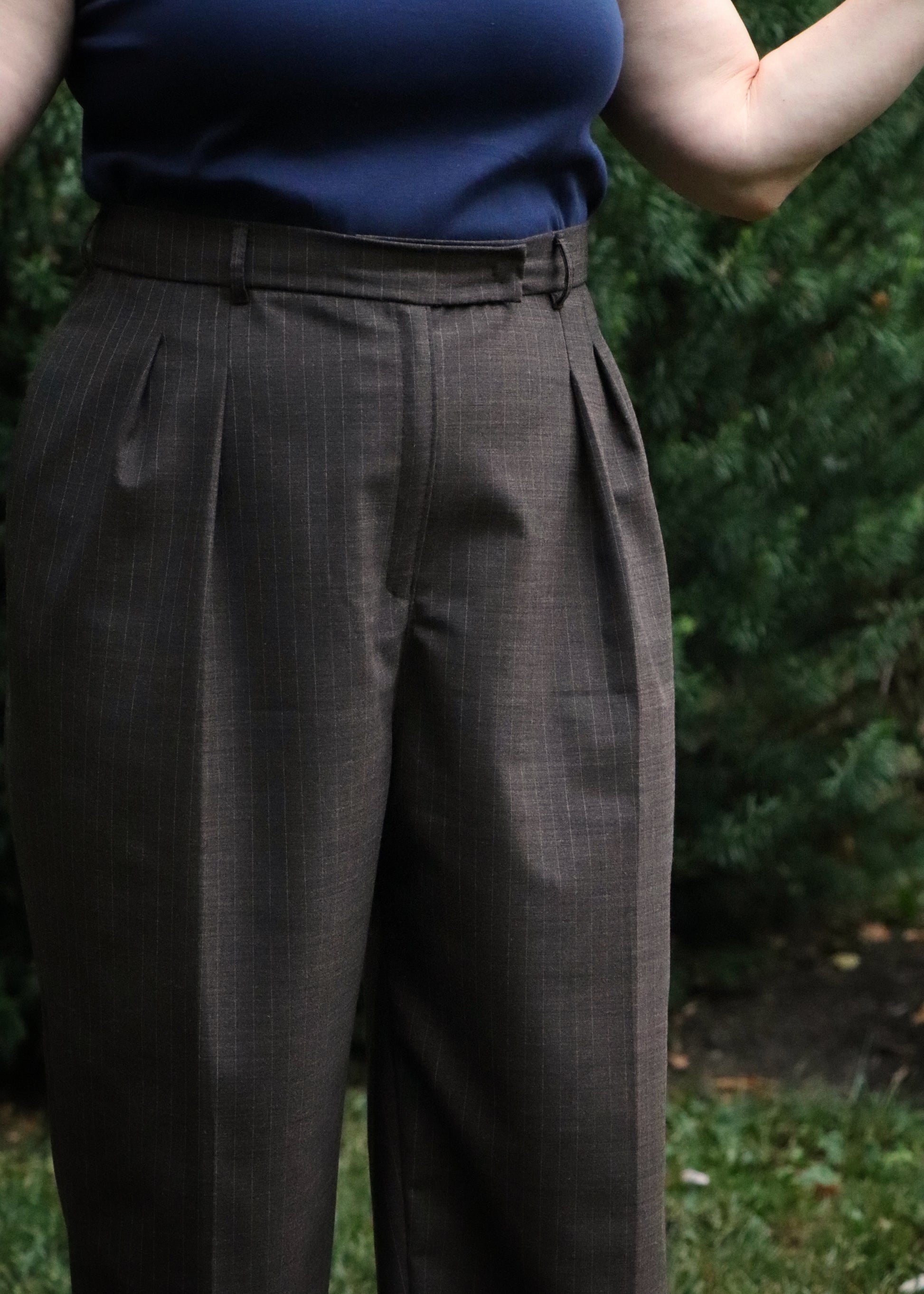 The Olive Pants are a vintage inspired pleated trouser designed with aesthetic and utility in mind! This pattern features double forward pleats, a zipper fly, straight leg, and two pocket options.
