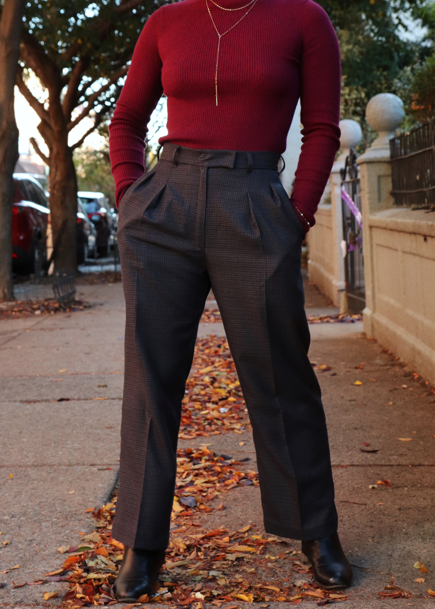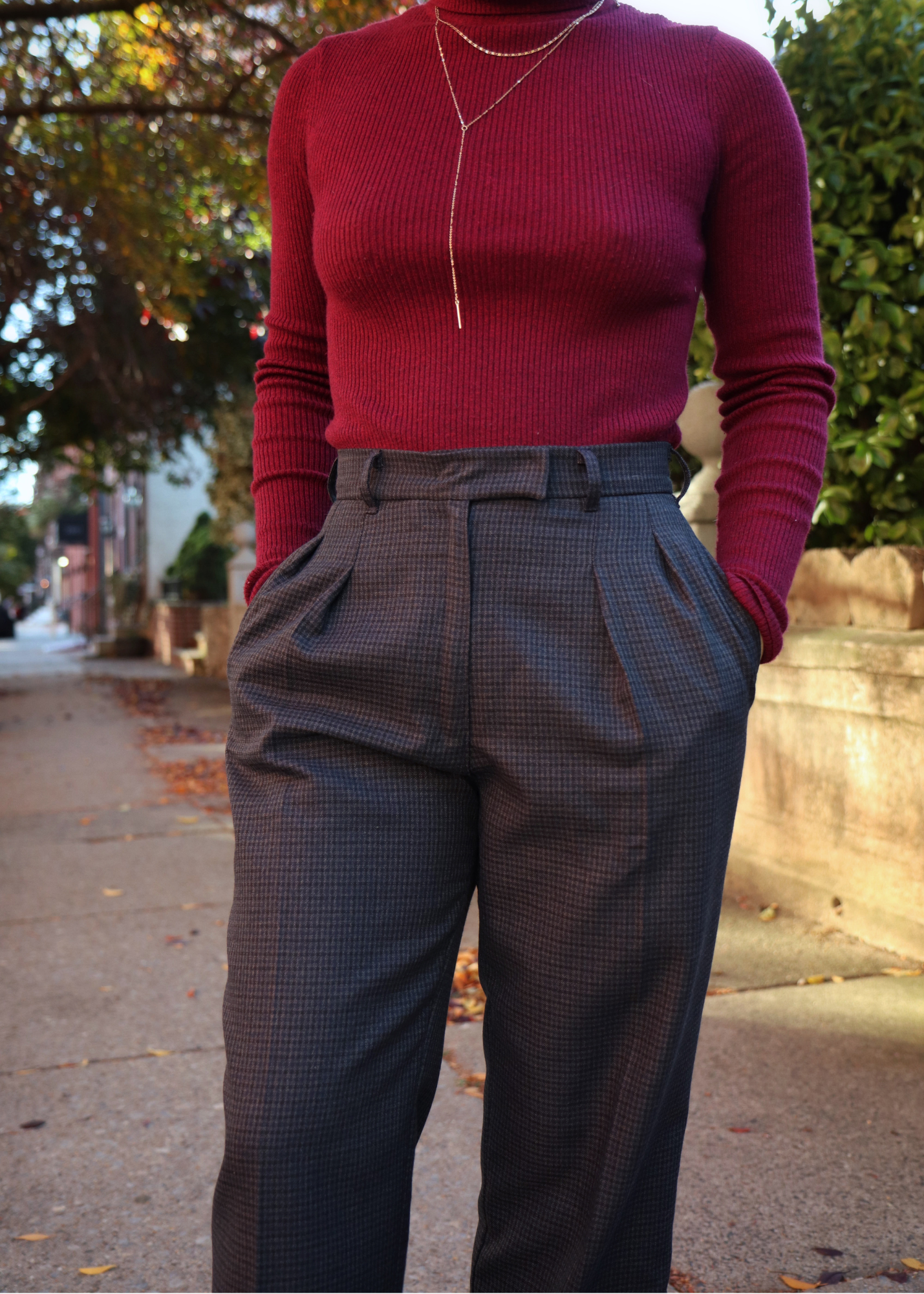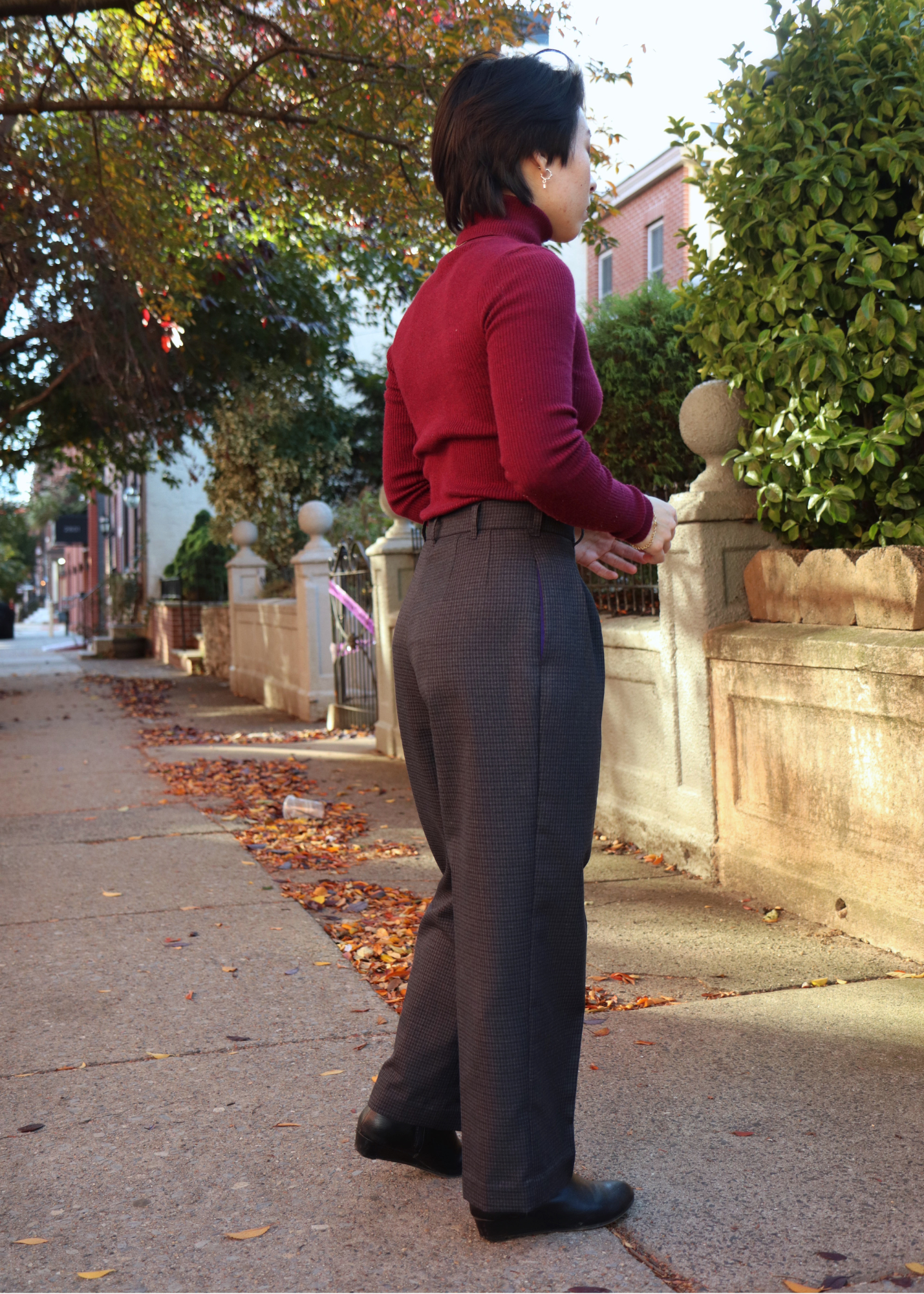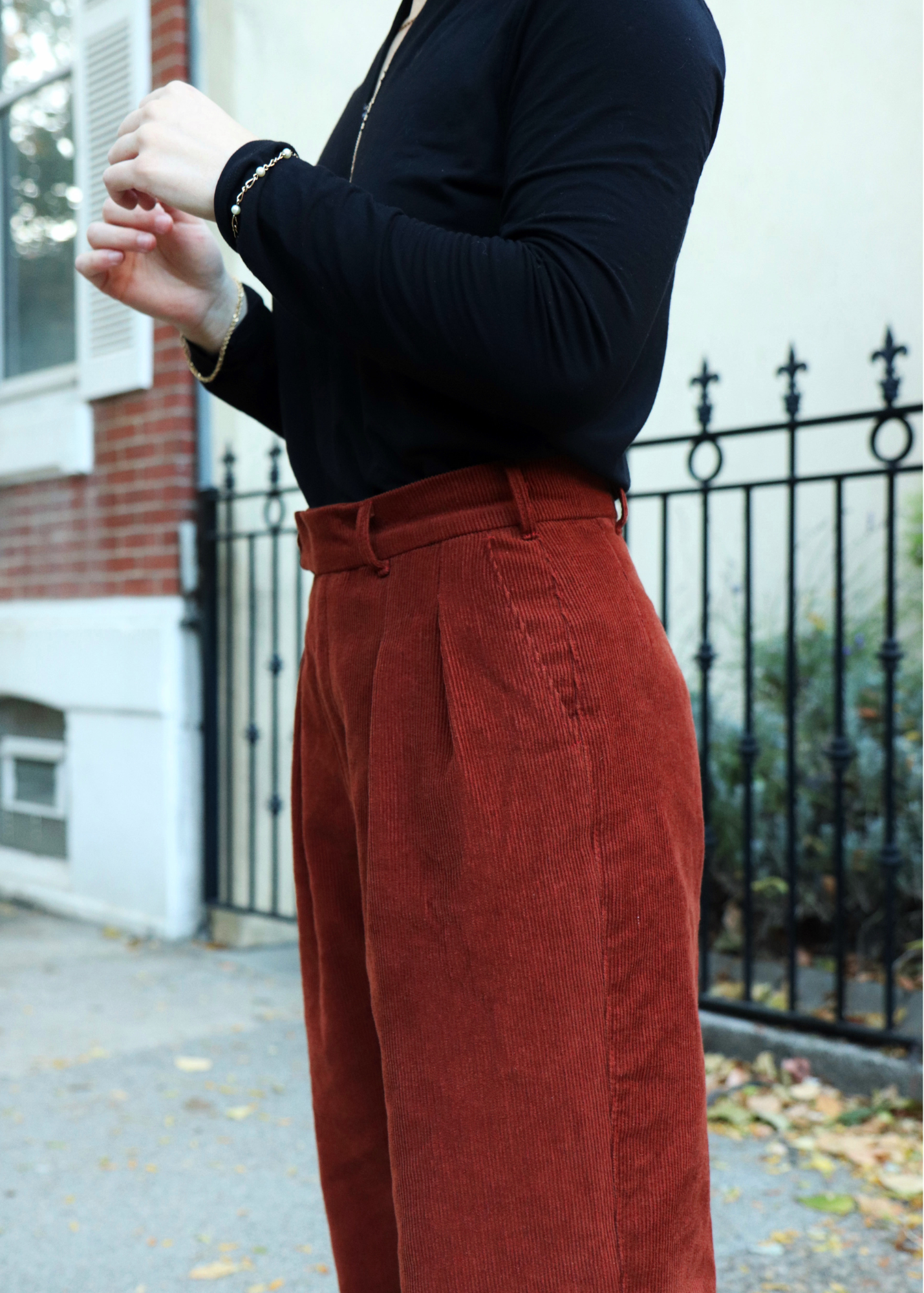 The Olive Pants are a vintage inspired pleated trouser designed with aesthetic and utility in mind! This pattern features double forward pleats, a zipper fly, straight leg, and two pocket options.