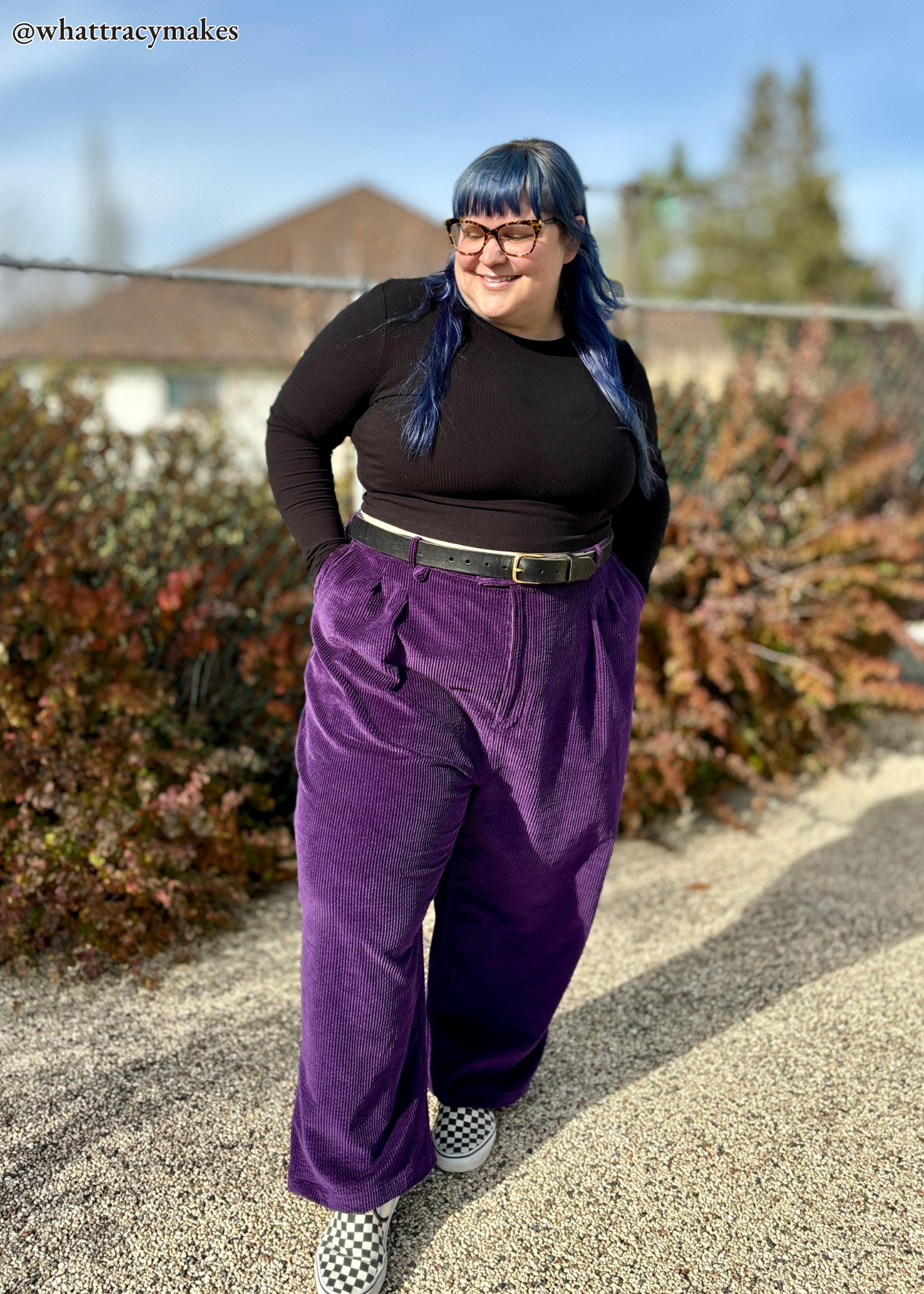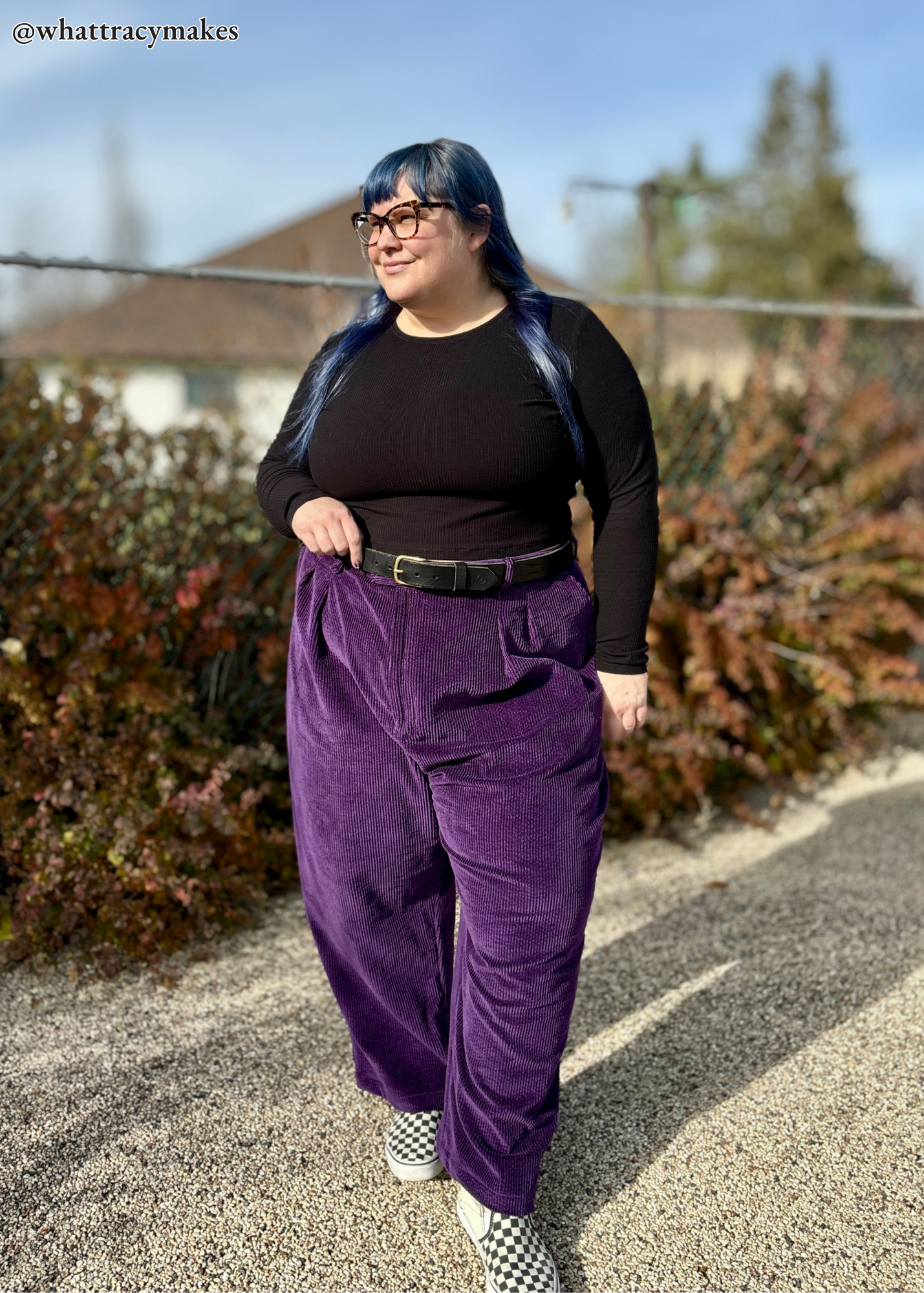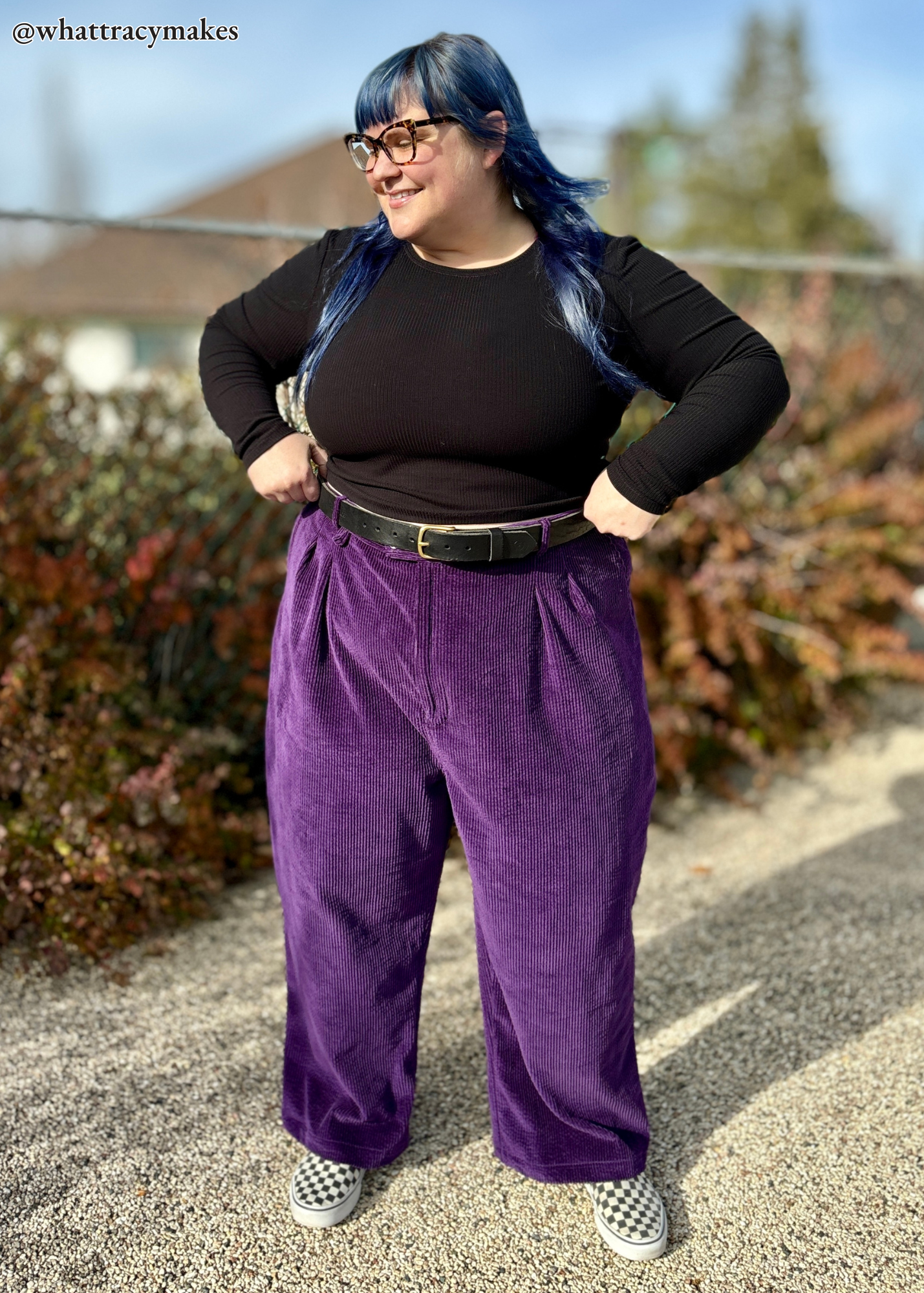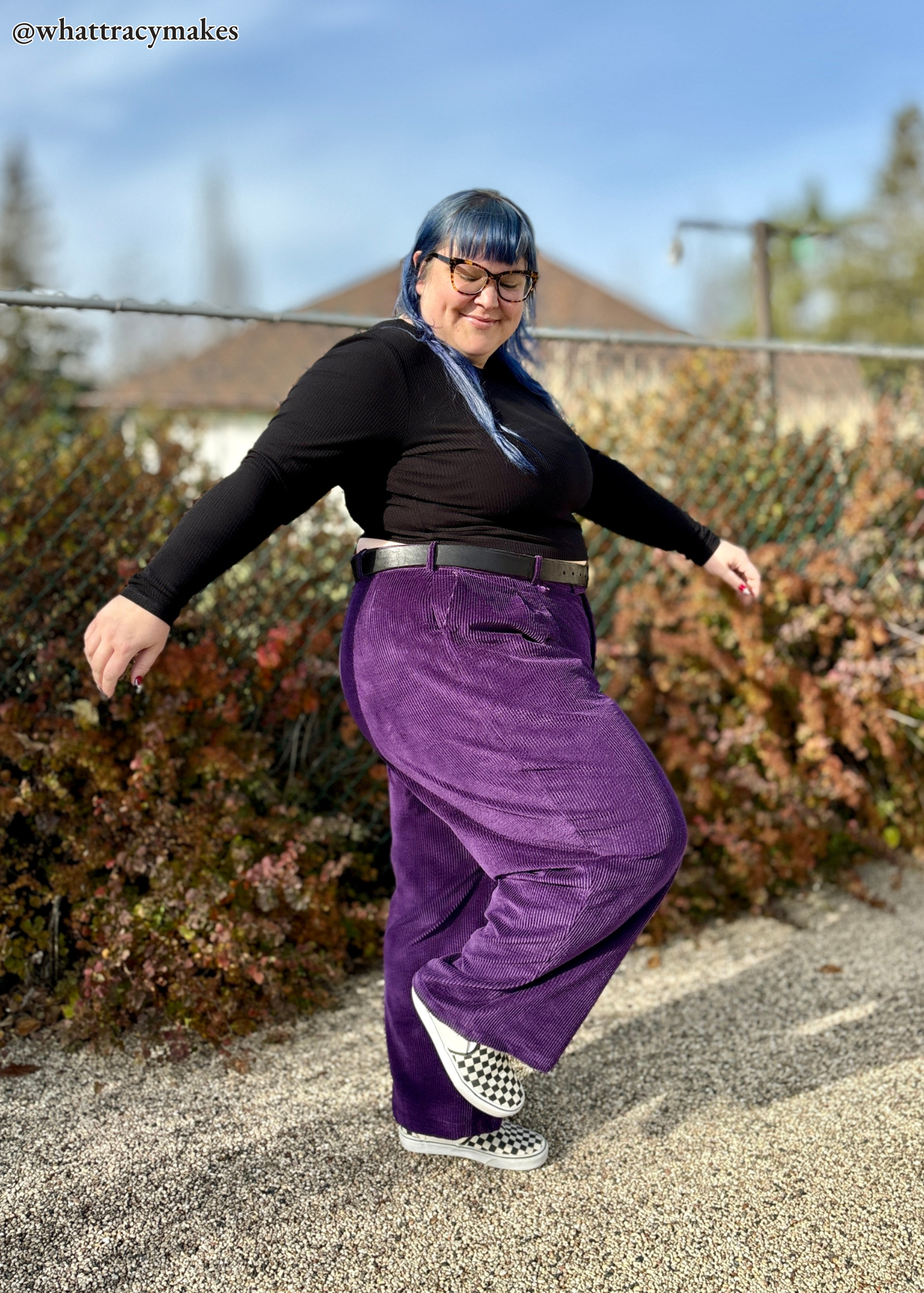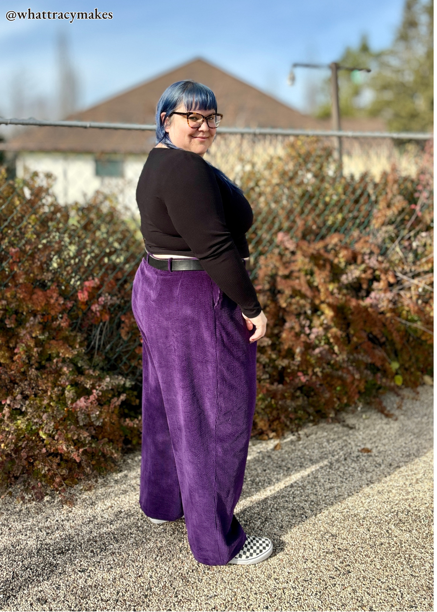 Tracy in purple bubble corduroy V2 is wearing size L graded to size K at the waist with rise lengthened 2" and inseam shortened 3". She is 5'4 with 44" waist and 55" hip.