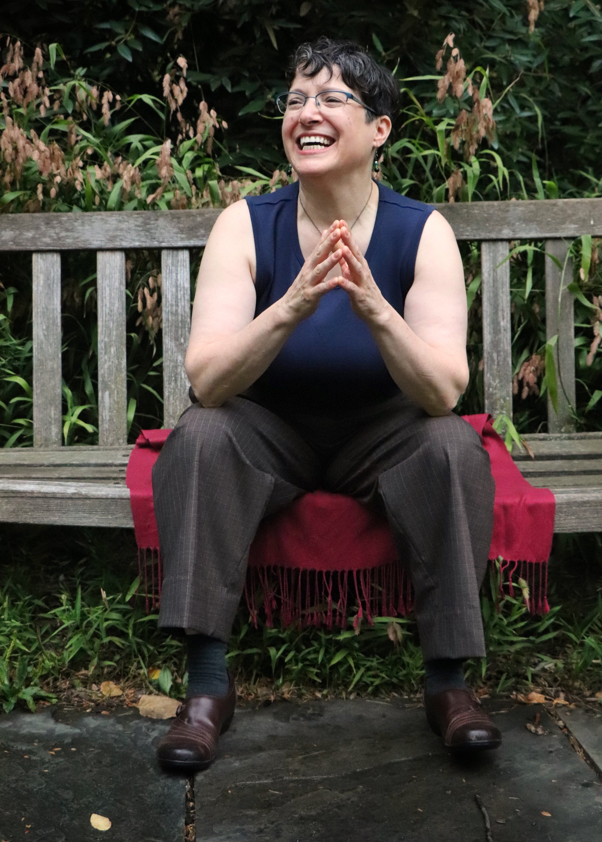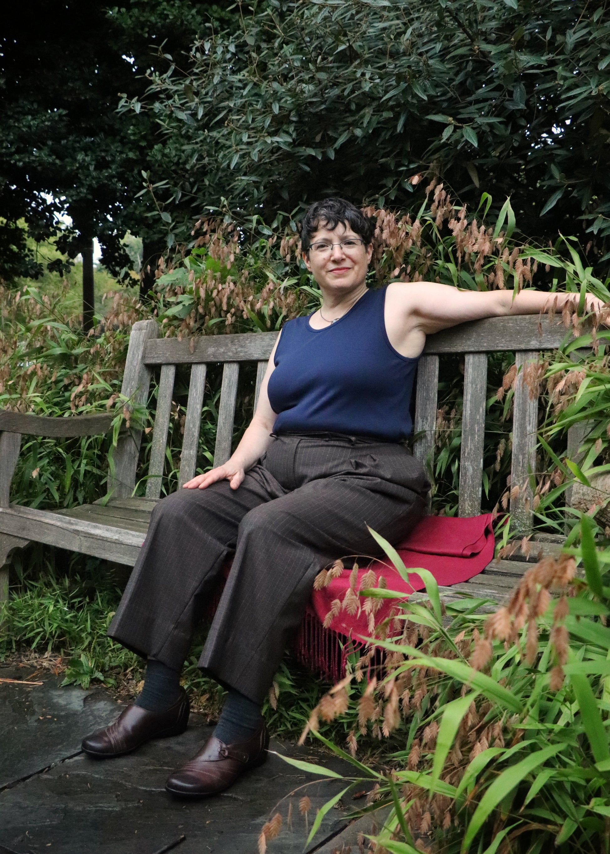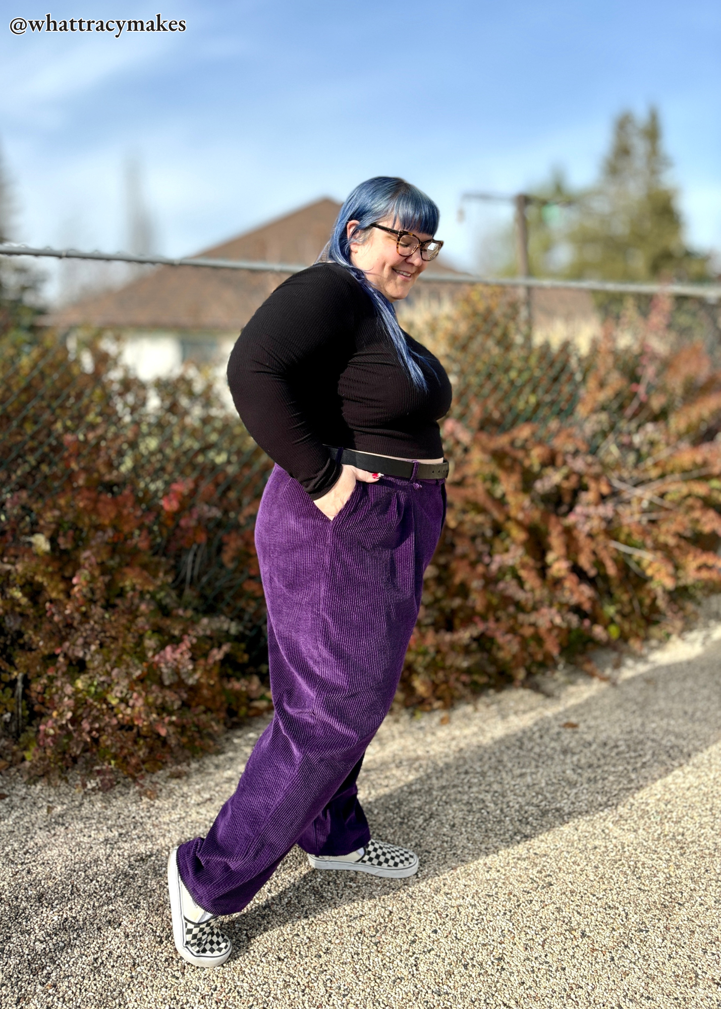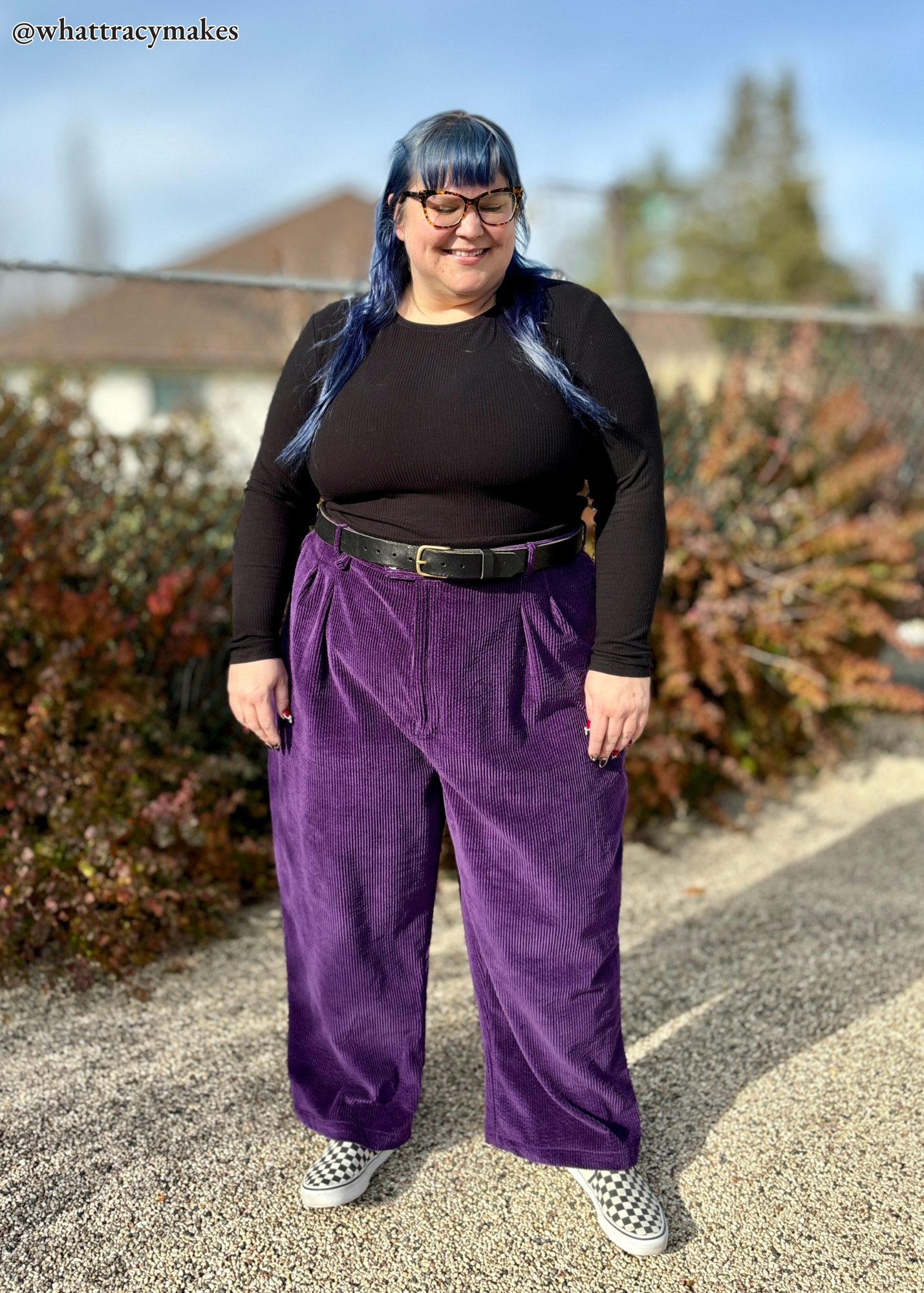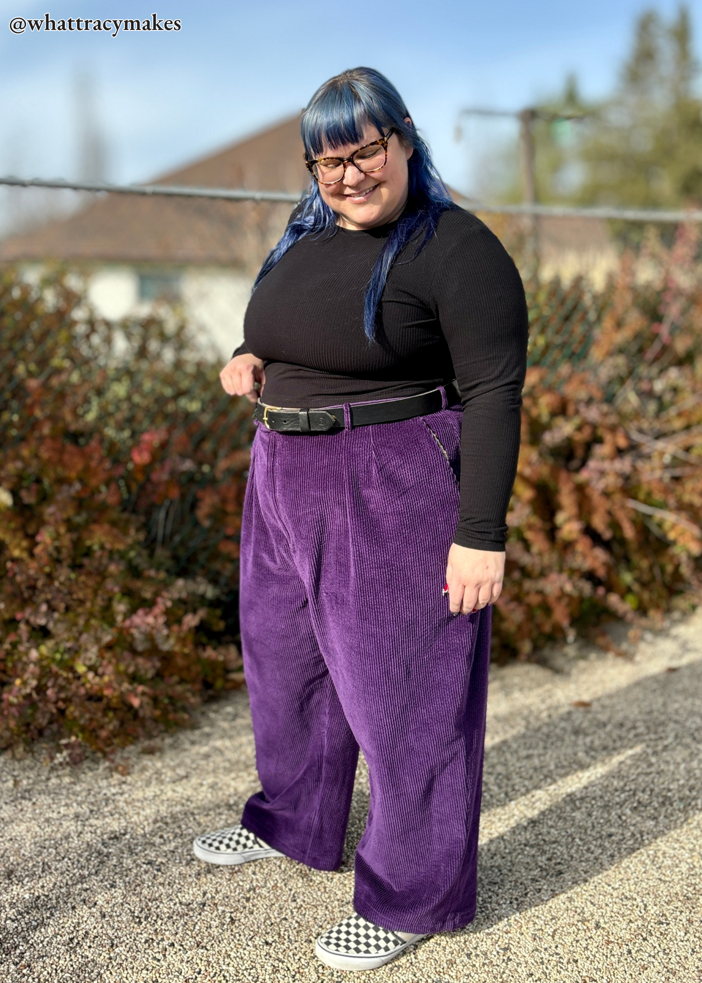 Tracy in purple bubble corduroy V2 is wearing size L graded to size K at the waist with rise lengthened 2" and inseam shortened 3". She is 5'4 with 44" waist and 55" hip.