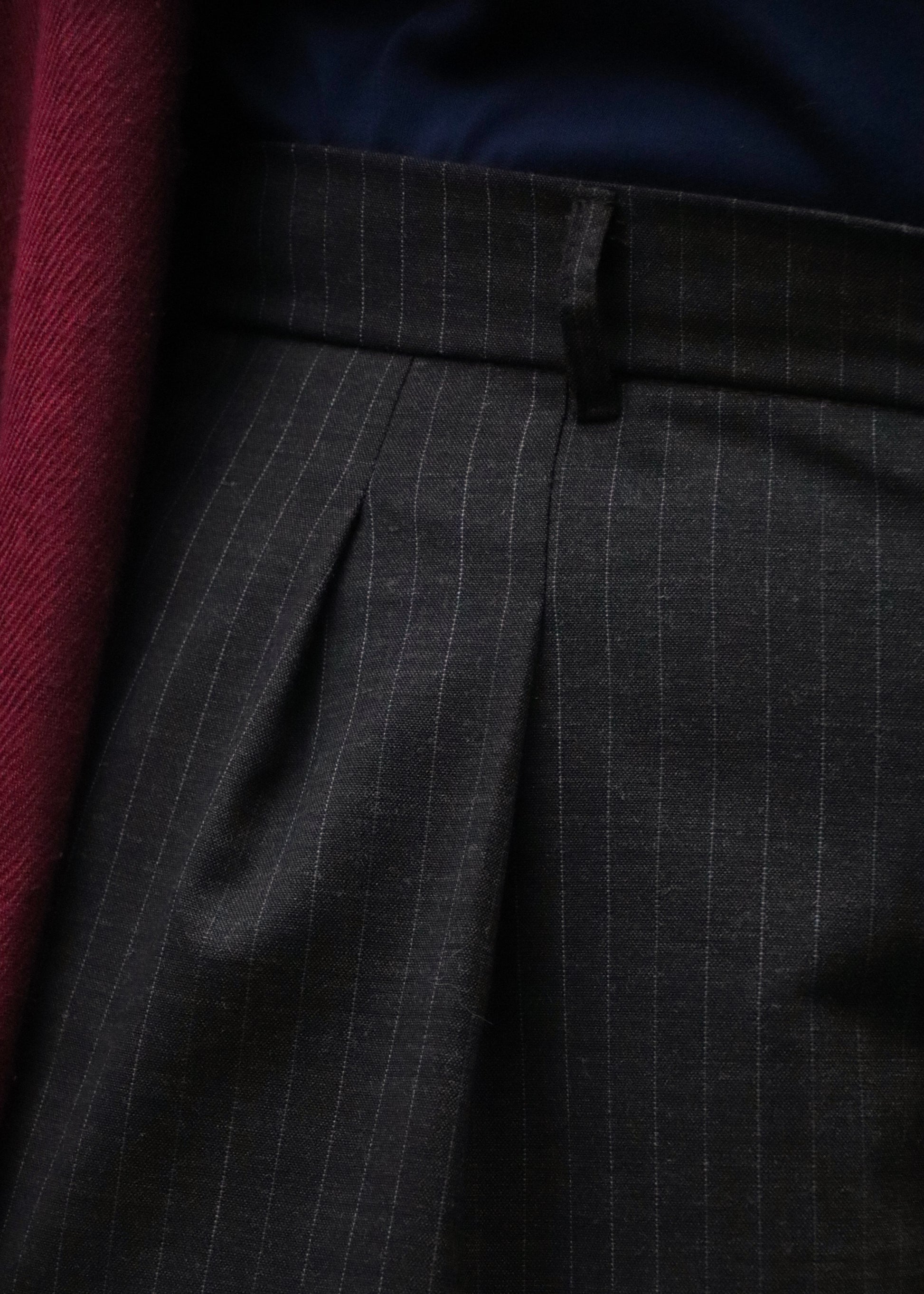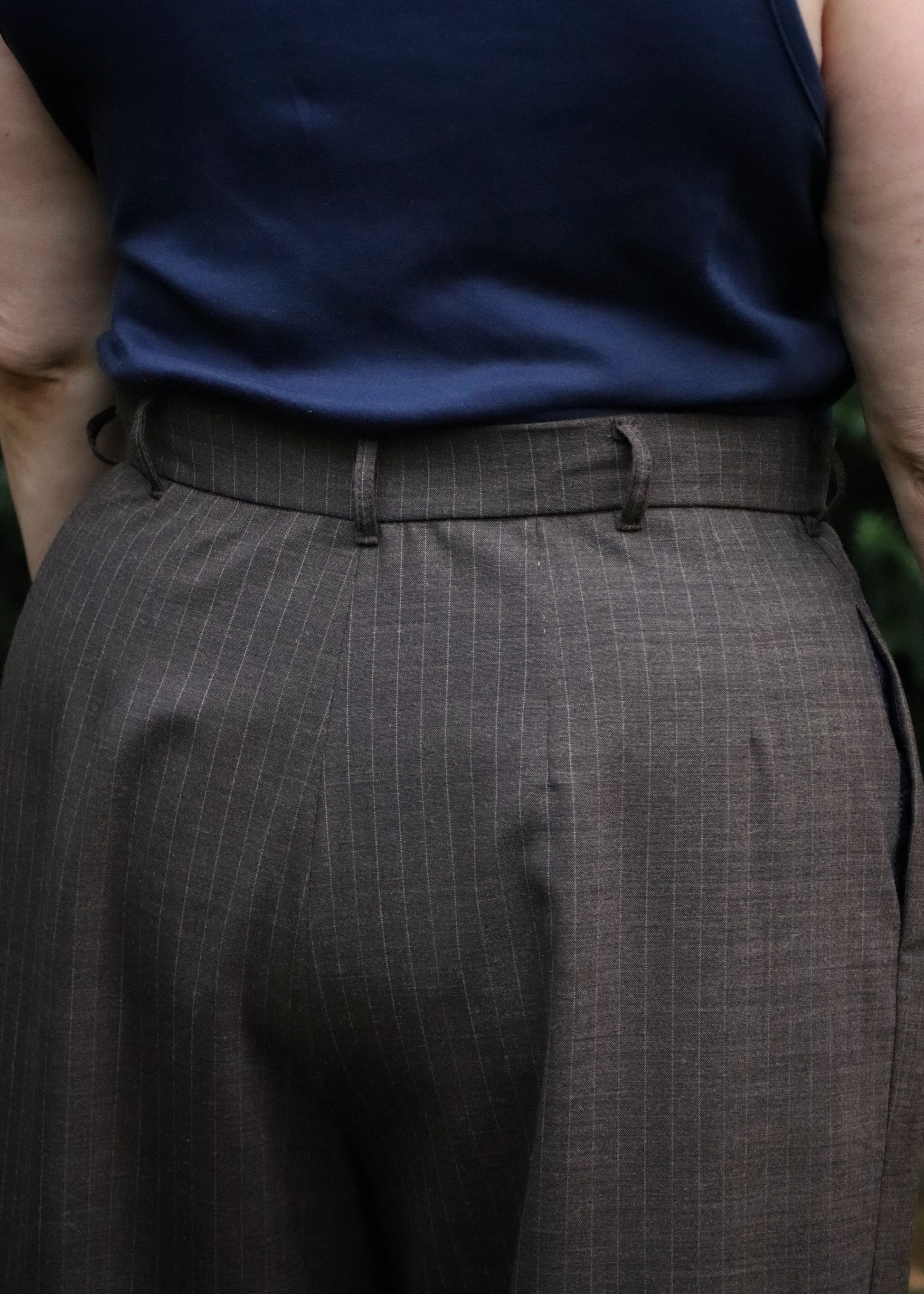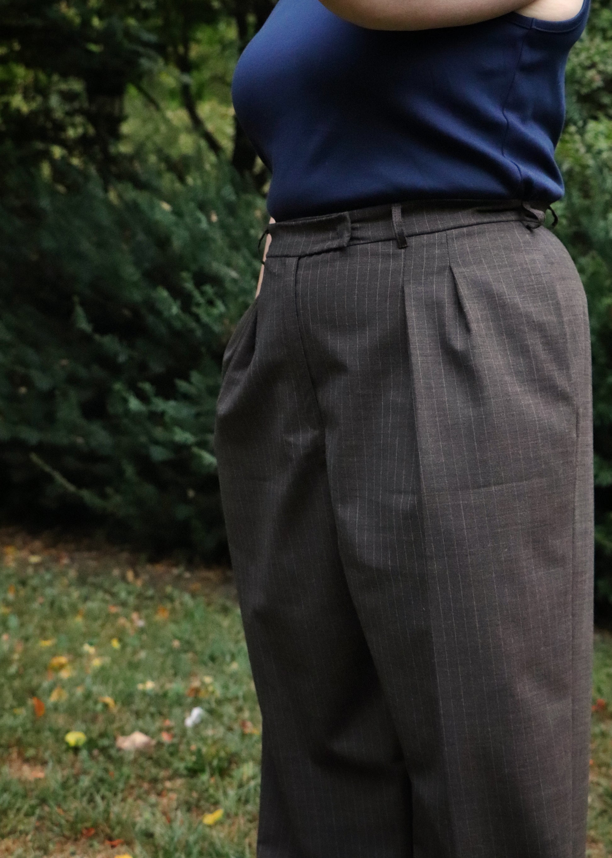 Ellie in the grey pinstripe V1 is wearing size G graded to H in the high hip and then back to G with rise lengthen 0.5" at the side via the TDCO fitting method. She is 5'3 with 35.5" waist and 45" hip.