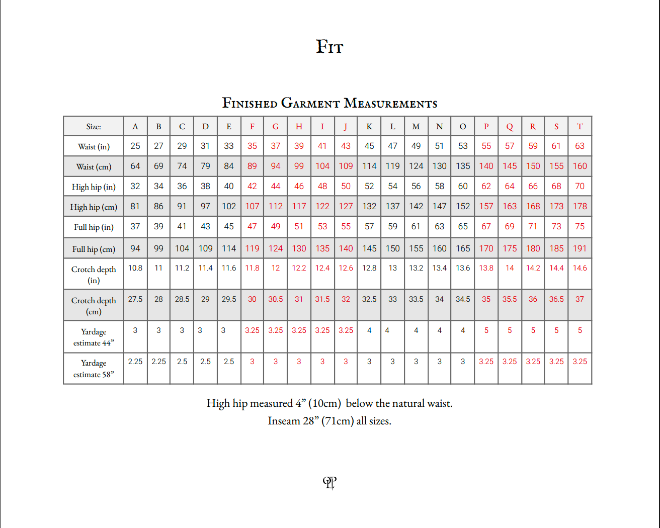 This pattern was designed for a "curvy" fit model with a 10" difference between waist and hip and thick thighs. You don't have to have this body type to use this pattern but it may require more fitting or grading between sizes if you have a much smaller or larger difference between waist and hip than this pattern was drafted for.