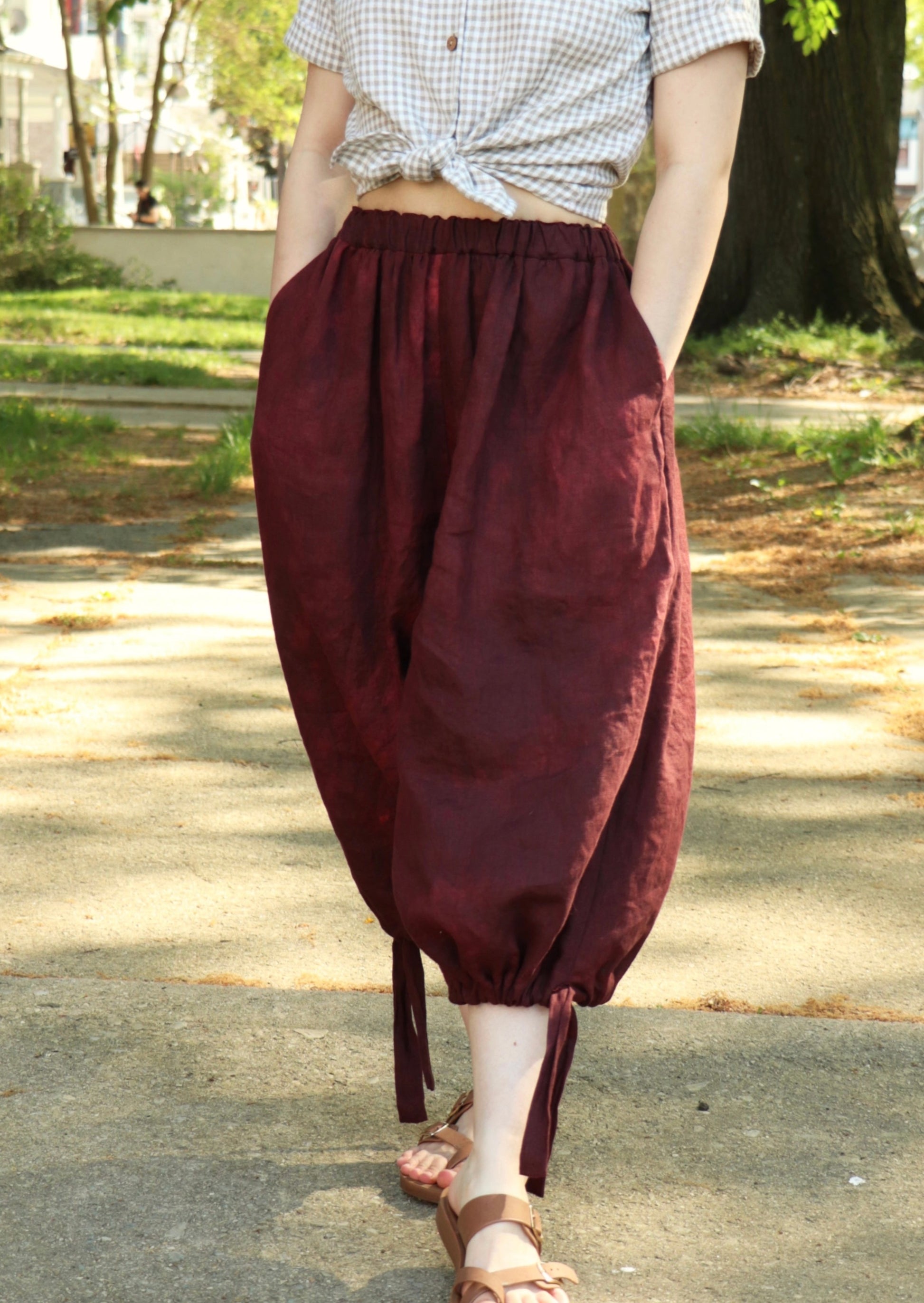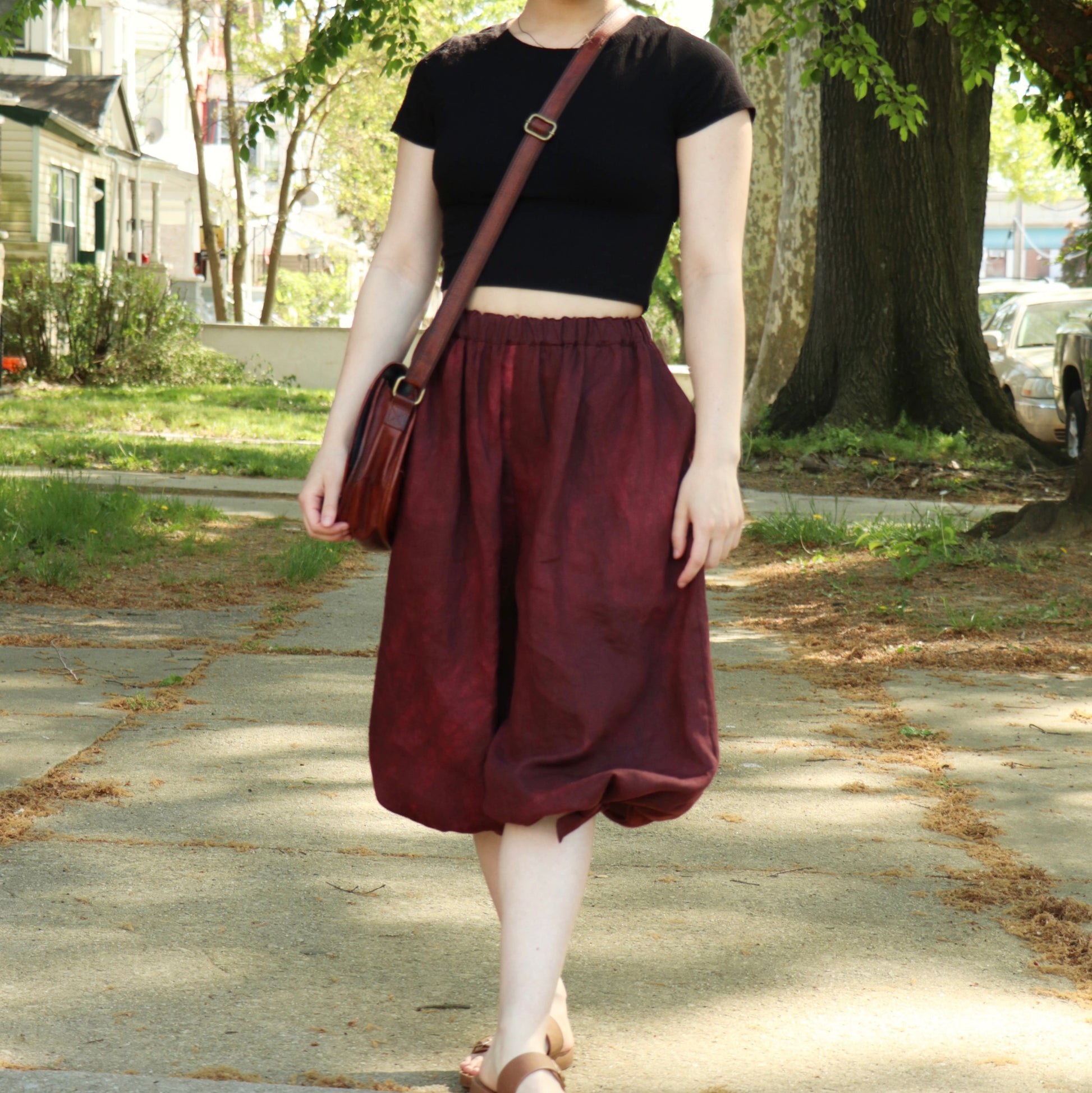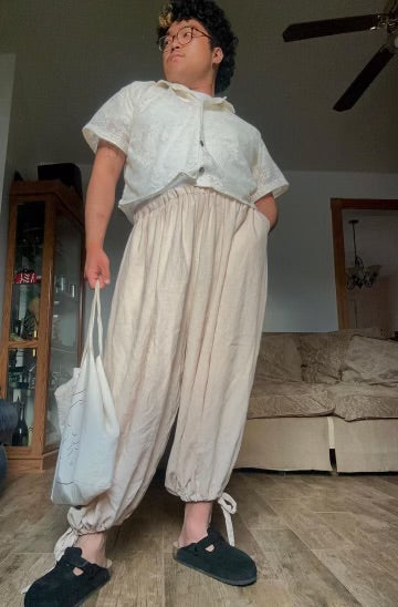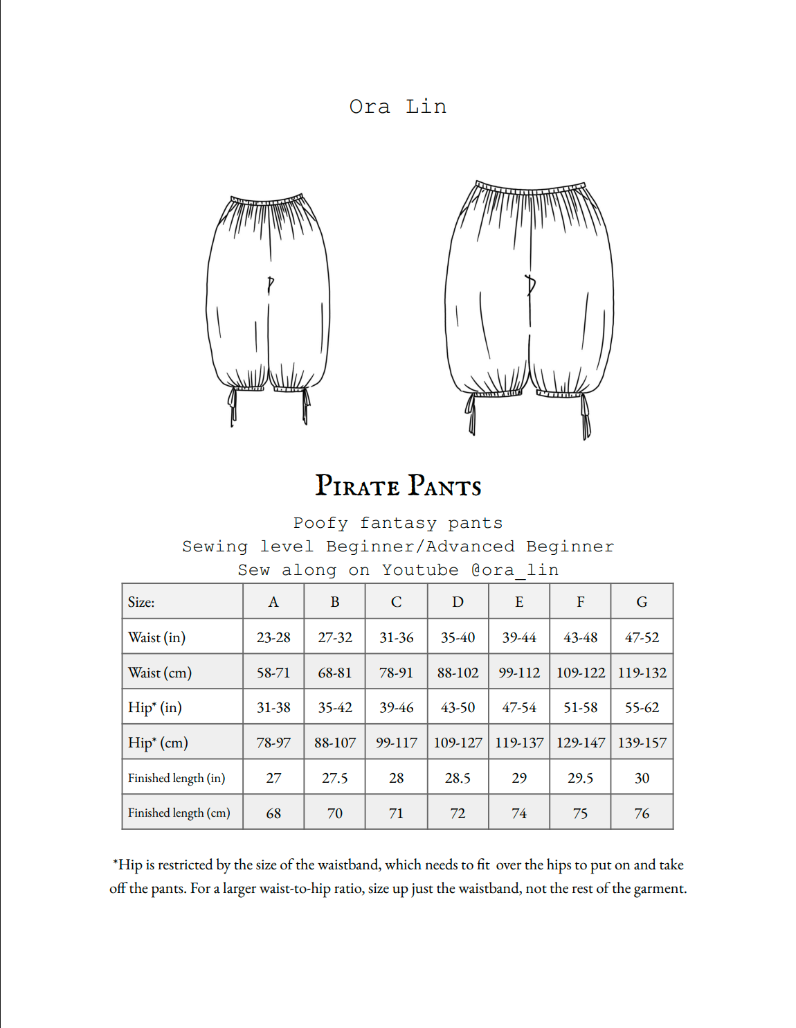 Pirate Pants are a wonderfully versatile garment that can be styled in nearly ANY aesthetic- modern, alternative, fantasy, historical, steampunk, you name it! These historically inspired cropped pants feature deep slash pockets, an elastic waistband, and ties at the cuffs. They combine modern comfort and functionality with a timeless shape that is reminiscent of many different cultures and time periods! The simple shapes of this pattern make it easy adjust. (shorten, lengthen, add or subtract fullness) This pattern can be used anywhere from a base for a cosplay, to everyday clothing! The options are endless!